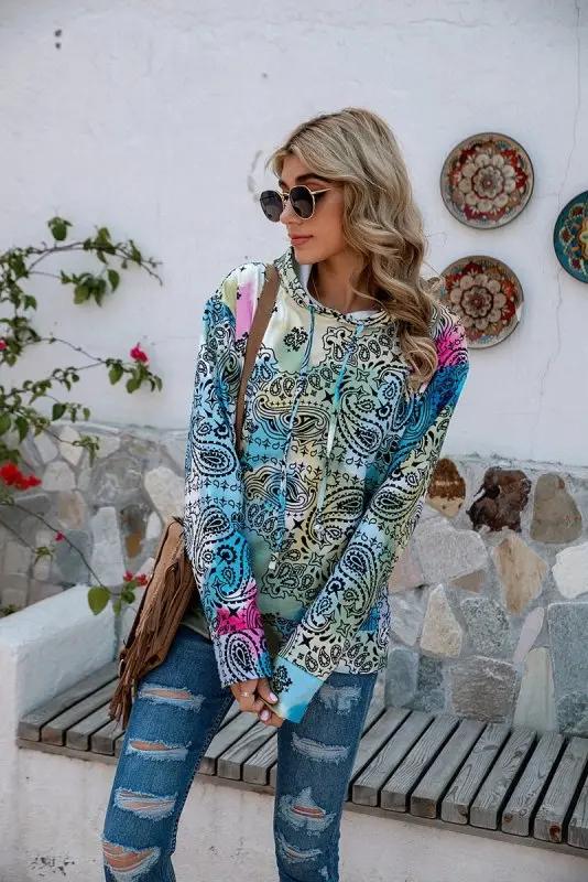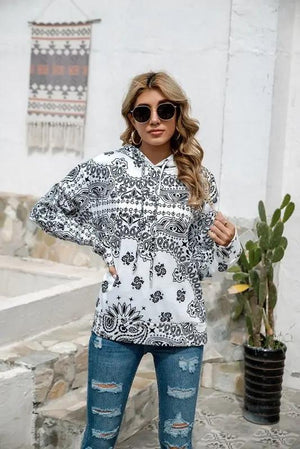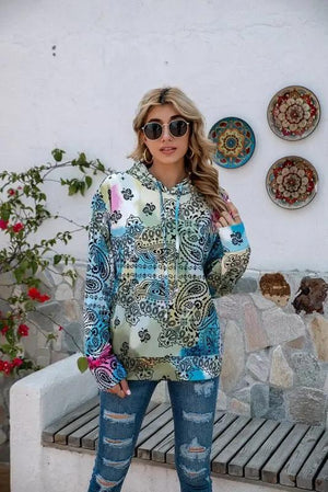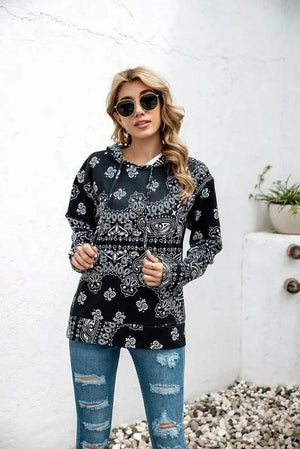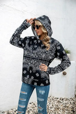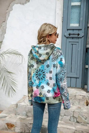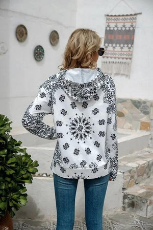 Women's Bohemian printed hooded sweatshirt with fleece lining