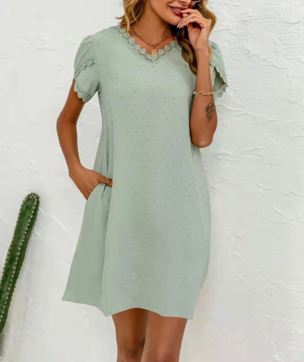 Spring Summer Women V-neck T-shirt Lace Petal Sleeve Pocket Fur Ball Dress