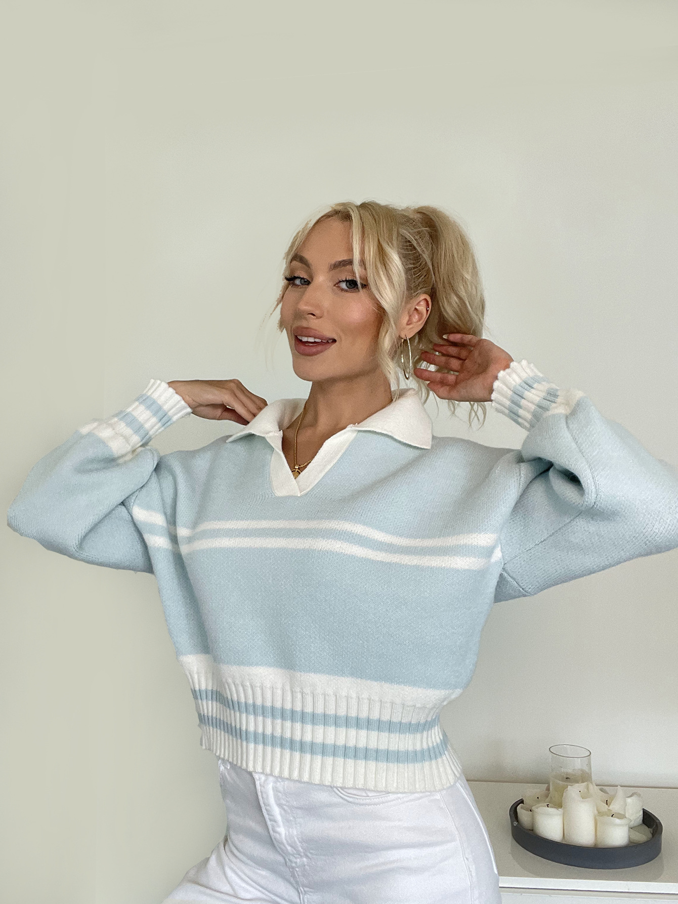 Women Wear Autumn Winter Polo Collar Striped Sweater Casual Loose Knitted Pullover Sweater Top